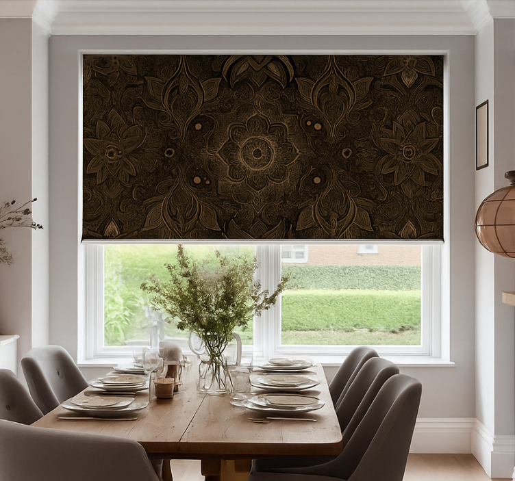 Reference: E5940Transform your dining space with the stunning Black and gold mandala dining room roller blind. This exquisite design features intricate mandala patterns in a captivating black and gold color scheme, creating a striking visual impact while enhancing the overall aesthetic of your room. The blend of elegance and artistry makes it a perfect addition to any decor style, adding sophistication and warmth to your home!