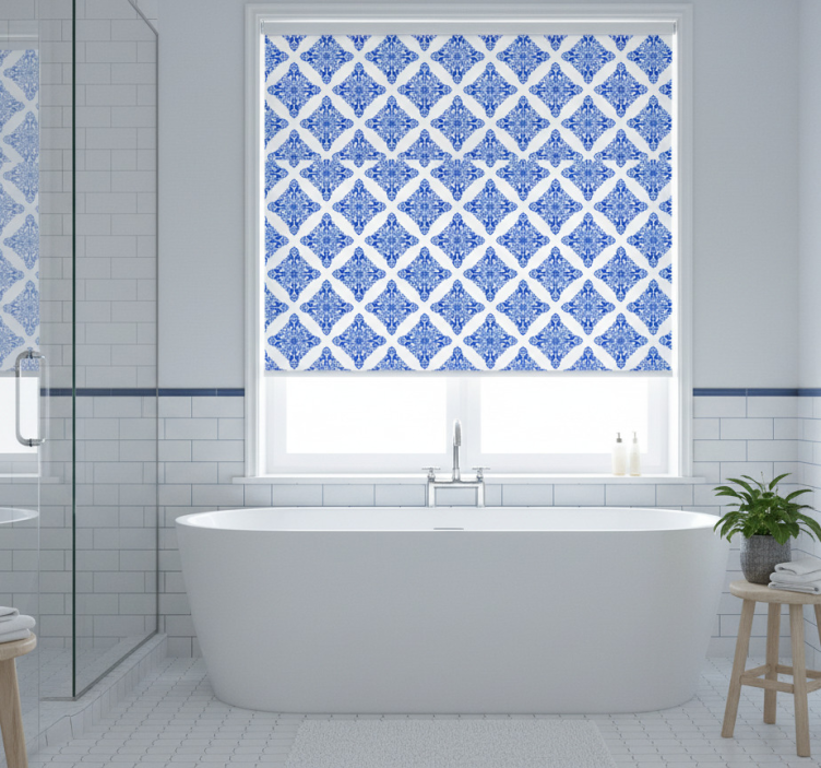 Blue roller blind in a patterned blue design