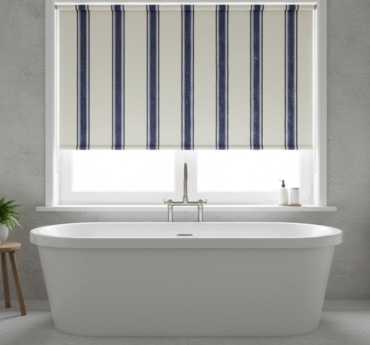 Blue roller blind with navy blue vertical lines