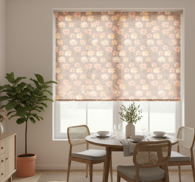 Reference: E6702Transform your living space with our Dining room roller blind aquarella pastel flowers. This delightful roller blind showcases a stunning pattern of pastel flowers, bringing a touch of nature indoors. The soft color palette beautifully harmonizes with various interior styles, making it an ideal choice for those looking to enhance their dining room decor. Designed for both functionality and elegance, this roller blind not only elevates your space but also offers practical benefits such as easy cleaning and the ability to regulate light and privacy.