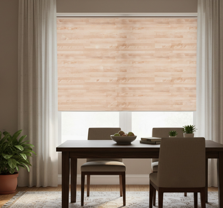 Our Dining room roller blind elegant brown wood dining room roller blind is the perfect addition to elevate your home's decor. Imagine dining with family and friends under the warm, inviting tones of this exquisite roller blind, which not only enhances your space visually but also creates a cozy atmosphere. It’s more than just a window covering; it’s a statement piece that blends functionality with elegance in your dining area!
