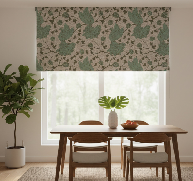 Reference: E6548Transform your living space with our Dining room roller blind green birds on jute background. This stunning design showcases delicate green birds gracefully perched against a natural jute background, creating a harmonious blend of elegance and nature. The unique pattern not only adds a touch of whimsy but also brings a sense of tranquility to your dining room. With easy assembly in just two clicks, this roller blind is designed to enhance your home effortlessly!