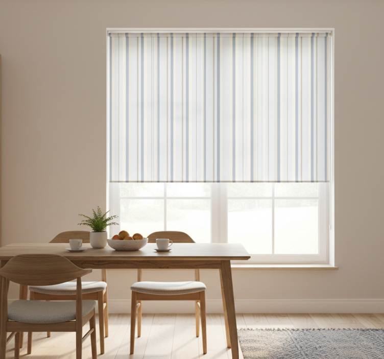 Dining room roller blind in 80's blue and beige stripes
