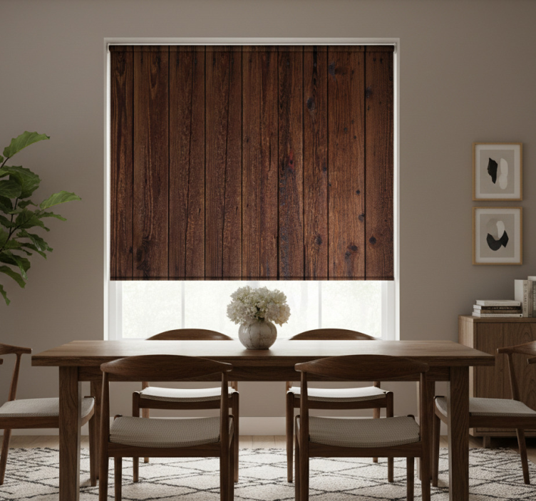 The Dining room roller blind in dark brown wood planks dining room roller blind is an exceptional choice for those looking to enhance their home decor. Its rich wood-like texture and warm tones create an inviting atmosphere, making your dining area feel cozy and elegant. Imagine hosting friends and family under the soft glow of natural light filtered through this exquisite blind. It not only beautifies your space but also complements various styles, from rustic to modern, inspiring you to create a harmonious living environment!