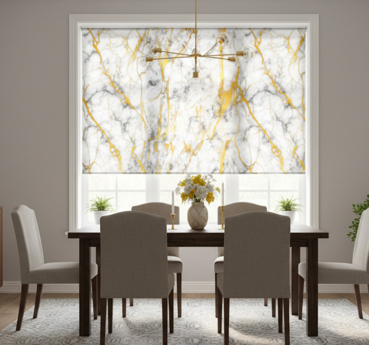 This Dining room roller blind in elegant gray and gold marble dining room roller blind is more than just a window covering; it is a statement piece that transforms your space into a stylish retreat. The rich hues and intricate design create a warm and inviting atmosphere, inspiring gatherings and memorable meals. By incorporating this roller blind into your decor, you not only enhance the aesthetics of your dining room but also elevate your overall home experience!