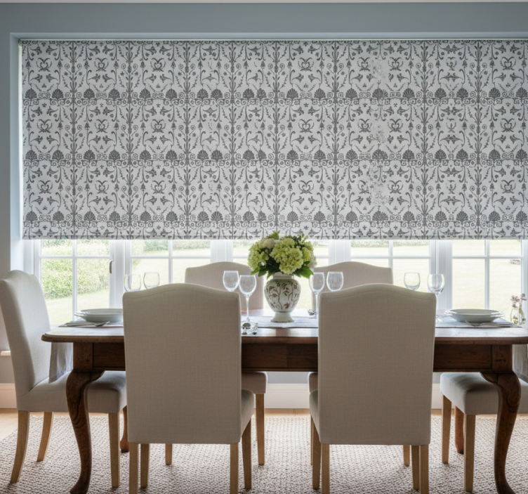 Reference: E6587Transform your living space with our Grey french provincial style dining room roller blind, a perfect blend of elegance and functionality! This exquisite design features a beautiful grey hue that brings a touch of sophistication to any dining room. The roller blind is not only visually appealing but also practical; it offers easy assembly in just 2 clicks, allows for quick cleaning, and provides excellent privacy when lowered. Enjoy the perfect balance of light and comfort as the blind protects your room from direct sunlight while also allowing you to regulate the room temperature.