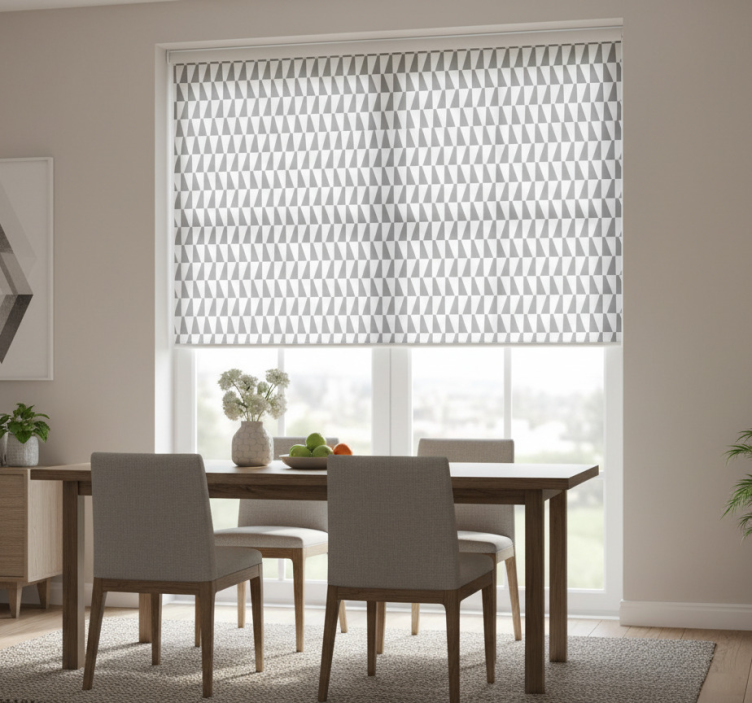 Our Dining room roller blind in gray triangles dining room roller blind is an exquisite choice for anyone looking to elevate their living space! Its captivating design serves as a beautiful focal point, effortlessly blending with modern and traditional interiors alike. Enhance your dining area with this stylish roller blind that also provides privacy when lowered, ensuring a cozy atmosphere during meals.