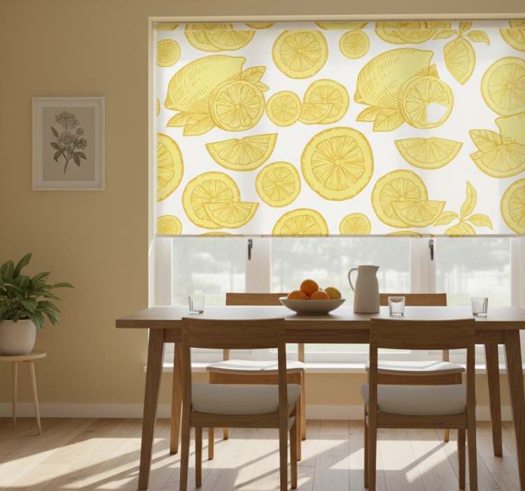 Reference: E6730Introducing our stunning Dining room roller blind orange and lemon design, a perfect fusion of vibrant citrus graphics that will transform your living space! This delightful design features a playful mix of juicy oranges and zesty lemons, creating an uplifting atmosphere that brightens any dining room. With its easy assembly and disassembly in just two clicks, this roller blind is not only a feast for the eyes but also extremely practical. It protects your room from direct sunlight, provides privacy when lowered, and allows you to regulate the room temperature effortlessly!