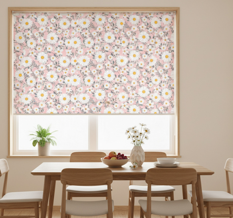 Reference: E6656Introducing our stunning Dining room roller blind pink daisy flower design, a delightful addition to your home! This beautifully crafted roller blind features a charming pink daisy flower pattern that effortlessly brightens up any dining room. With its easy assembly in just 2 clicks, effortless cleaning, and quick disassembly, this roller blind is both functional and aesthetically pleasing. It not only protects your space from direct sunlight but also offers privacy when lowered, allowing you to enjoy your meals in peace. Plus, it helps regulate room temperature and enhances the overall decoration of your home.