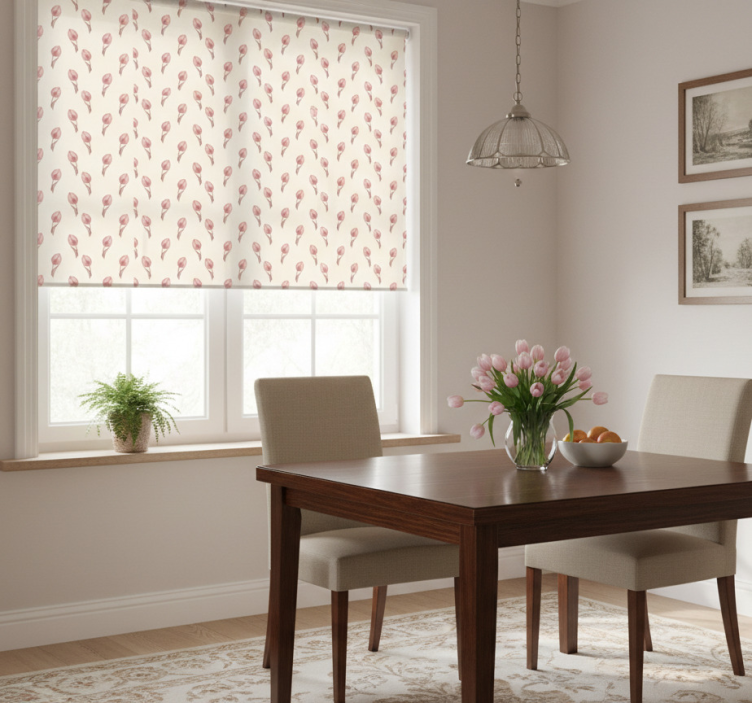 The Dining room roller blind small pink tulips pattern dining room roller blind is an inspiring choice for anyone looking to elevate their home decor. The whimsical tulip design brings a vibrant yet soothing ambiance to your dining area, creating a welcoming atmosphere for family gatherings and dinner parties. With its ability to regulate light and provide privacy, this roller blind is the perfect blend of style and practicality!