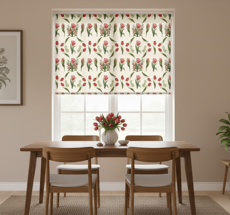 The Dining room roller blind spring with red tulips dining room roller blind is the perfect addition to elevate your home decor. Its enchanting floral design brings a sense of warmth and charm to your space, making every meal feel special. Imagine enjoying your family gatherings under the soft glow of natural light filtered through this exquisite roller blind! A blend of beauty and functionality, it is an inspirational choice for anyone looking to refresh their dining area.