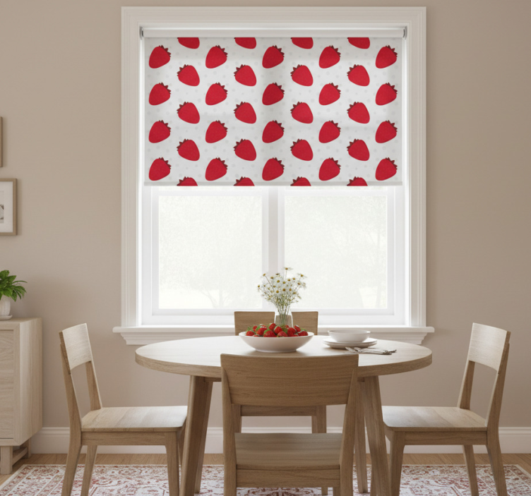 Reference: E6655Transform your living space with the Dining room roller blind with red strawberry pattern. This delightful design showcases vibrant red strawberries against a fresh background, evoking a sense of joy and warmth. The charming pattern not only enhances the aesthetic of your dining room but also brings a touch of nature indoors. With features such as easy assembly in 2 clicks, easy cleaning, and the ability to regulate room temperature, this roller blind is as functional as it is beautiful!