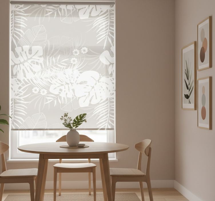 Reference: E6713Transform your living space with our Gray tropical leaves dining room roller blind, featuring a stunning design that combines elegance and functionality. This roller blind showcases a delightful blend of tropical leaves in soft gray tones, making it a perfect addition to any dining room. Its artistic pattern not only enhances your decor but also brings a touch of nature indoors, inviting warmth and serenity into your home.