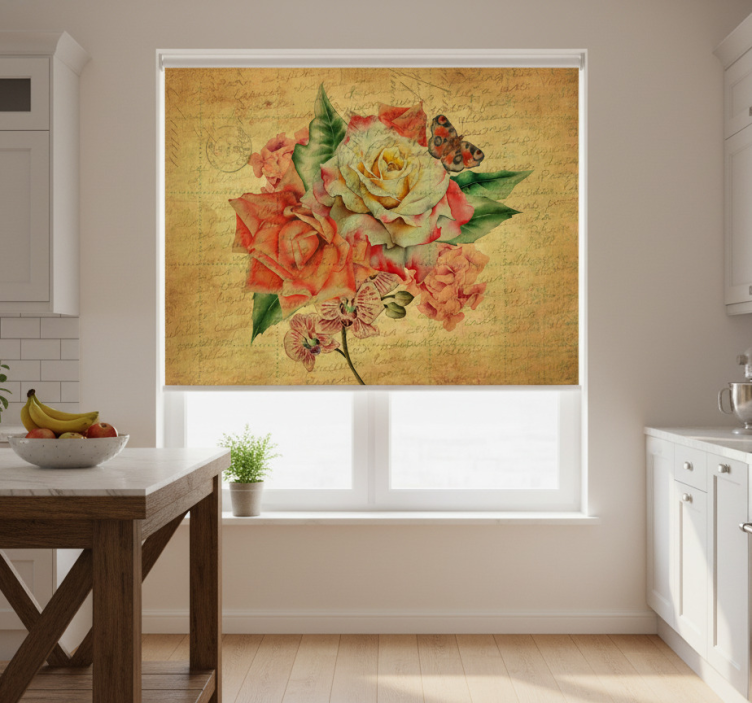 Kitchen roller blind with rose, butterfly, and writing