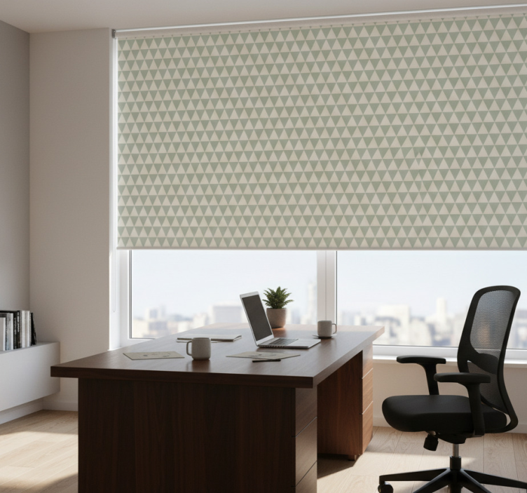 Reference: E7247Transform your space with our Office roller blind in grey triangle pattern, a stunning addition that combines modern design with functionality. Featuring an elegant grey triangle pattern, this roller blind enhances your office decor while offering essential features such as easy assembly in just two clicks, effortless cleaning, and quick disassembly. It effectively protects your room from direct sunlight, provides privacy when lowered, and allows you to regulate the room temperature, making it a practical choice for any environment!