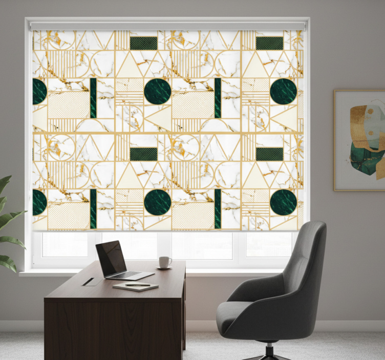 Reference: E7300Introducing our stunning Office roller blind in white marble geometric, a perfect blend of style and functionality! This roller blind features a captivating geometric design that mimics the elegance of white marble, creating a sophisticated atmosphere in any office space. With its easy assembly and disassembly in just two clicks, as well as effortless cleaning, this product is designed for convenience. It effectively protects your room from direct sunlight while providing privacy and regulating room temperature. The Office roller blind in white marble geometric not only enhances your decor but also offers security by allowing you to see outside without being seen.