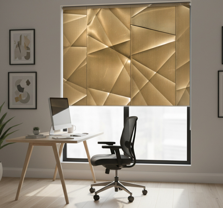 The Office roller blind with 3d golden polygon design office roller blind is not just a window covering; it's a statement piece that transforms your office into a stylish haven. By incorporating this roller blind into your decor, you elevate the entire ambiance, inspiring creativity and productivity. The mesmerizing golden polygon design seamlessly blends elegance with modernity, making it an ideal choice for anyone looking to enhance their office space.