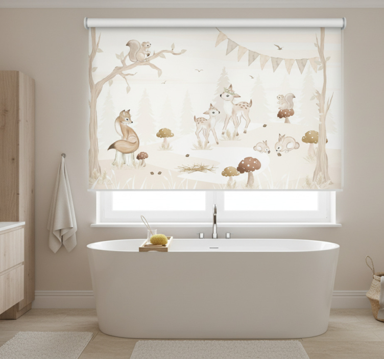 Reference: E6108Transform your child's space with our Whimsical woodland nursery tree roller blind, featuring enchanting tree designs that evoke a sense of wonder and adventure. The delightful graphics include charming woodland creatures and lush greenery, creating a serene atmosphere perfect for any nursery. This roller blind not only enhances the aesthetic appeal of the room but also serves essential functions such as controlling light and ensuring privacy!