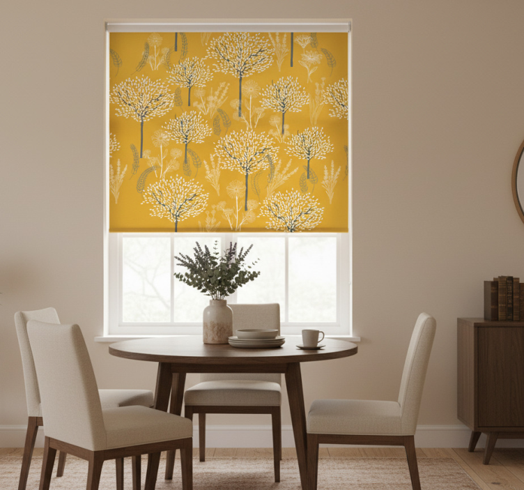 Reference: E8203Introducing our stunning Yellow roller blind with tree pattern, a unique blend of elegance and nature that transforms your space! This beautiful design features a vibrant yellow backdrop adorned with delicate tree motifs, creating a refreshing atmosphere in any room. Its easy assembly in just 2 clicks and effortless cleaning make it a practical choice for those who value both style and convenience.