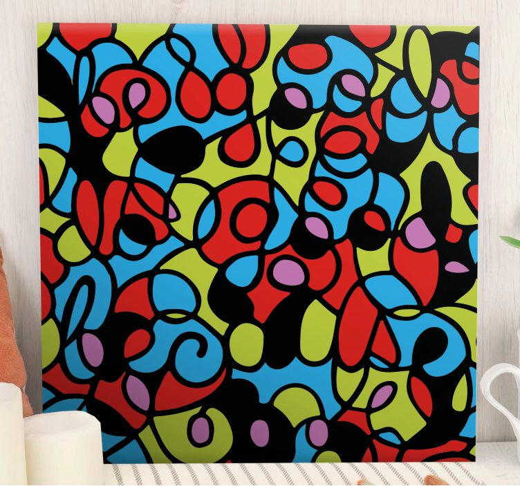 Reference: Q8726A vibrant composition featuring a dynamic array of swirling shapes. The design is characterized by a playful mix of colors, including bold reds, blues, and greens, interwoven in an abstract pattern. This captivating piece energizes any space with its lively design.