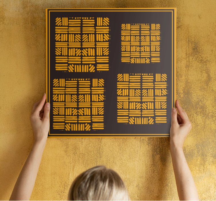 Introducing our Modern canvas art geometric design arrangement that beautifully combines African aesthetics with stunning gold and yellow hues. This artwork features intricate lines and shapes that create an abstract representation, all displayed within a sleek frame. The geometric patterns are arranged in a captivating grid format, making it a striking addition to any space!