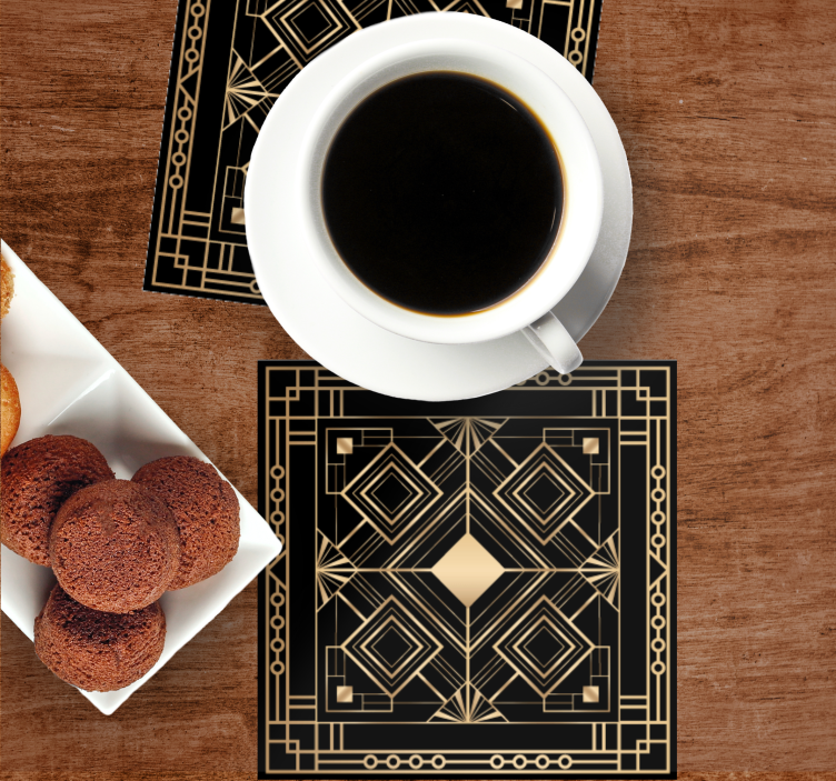 Introducing our stunning Geometric pattern with gold accents coasters, where elegant rhombus shapes and sophisticated black and gold tones come together in a beautiful illustration. Each coaster features a symmetrical design that adds a modern touch to any table setting, making it the perfect addition to elevate your decor!