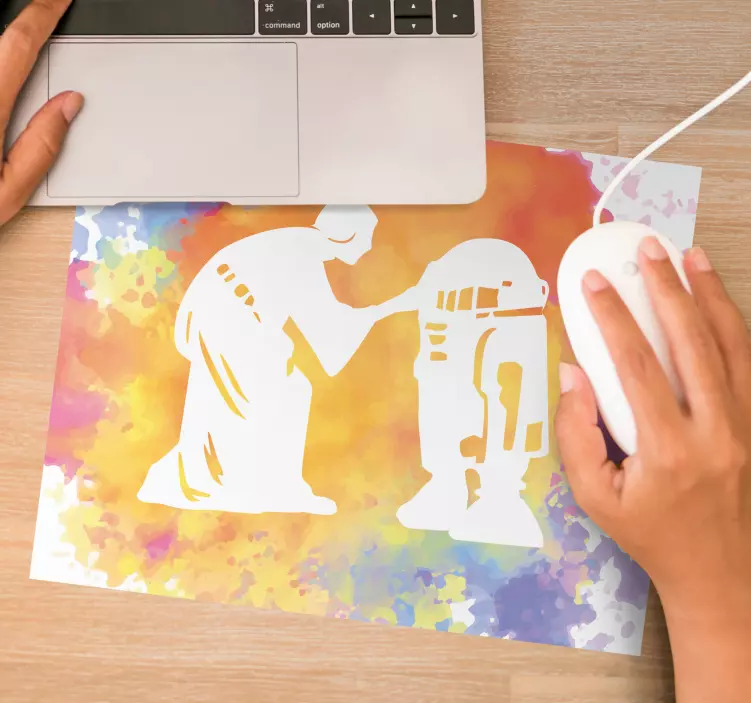 Introducing the Gaming mouse pad iconic robot interaction, a stunning fusion of artistry and functionality! This unique mouse pad features a breathtaking design that captures the essence of watercolour paint and illustration, showcasing an artistic representation of a sci-fi movie-inspired robot silhouette. The colorful elements evoke a sense of space and interaction, making it a perfect addition to any gaming setup!