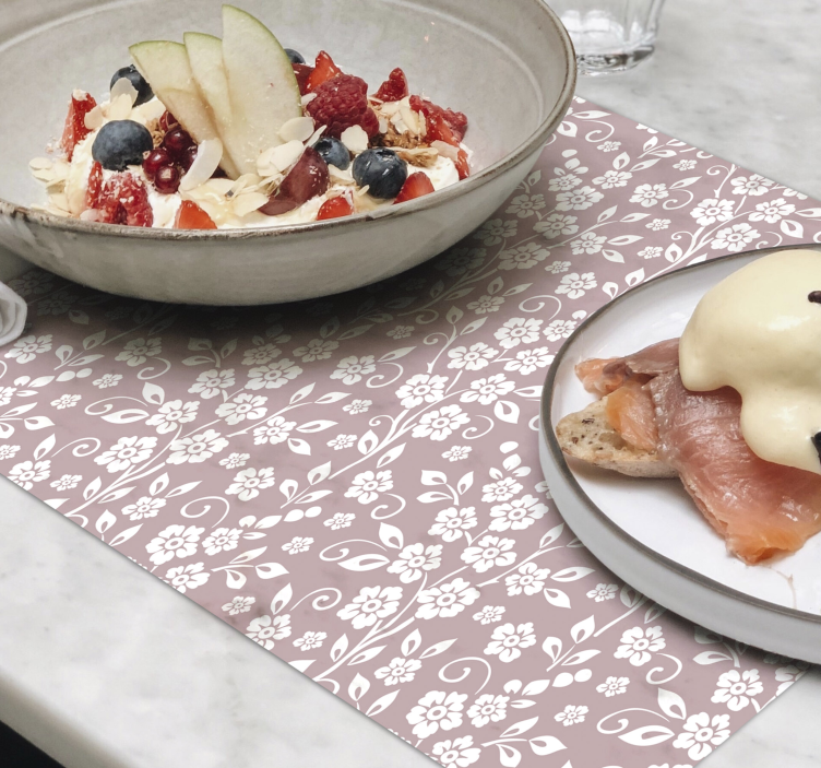Add a cozy atmosphere to your home with these white floral ornament placemats on a pinkish background. The beautiful design will make everyone feel like they are at home. Order these floral table mats today and say goodbye to boring tables. They are perfect for your kitchen or dining room.