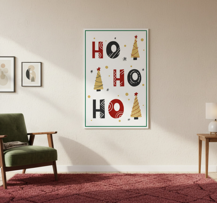 Reference: G1093Introducing our vibrant Christmas poster ho ho ho christmas text design, a delightful addition to your festive decor! This stunning design features bold, cheerful typography that spells out "Ho Ho Ho" in an eye-catching style, complemented by a semi-matt finish that eliminates reflections. With high colour intensity on a sturdy 180g/m2 grammage, this poster is perfect for spreading holiday cheer in any space.