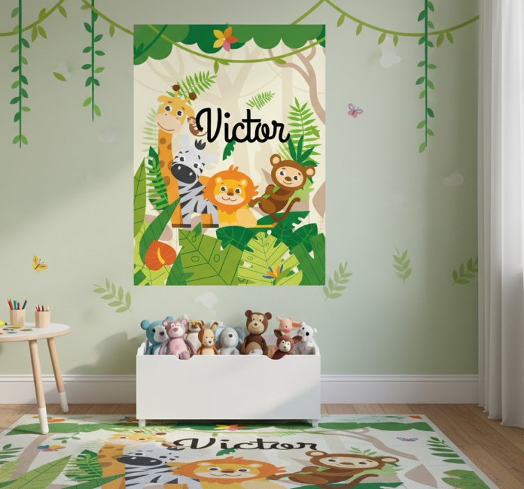 Reference: G940Introducing our stunning Custom jungle animals nursery poster, a delightful addition to your child's space! This beautifully designed poster features vibrant jungle animals in playful poses, surrounded by lush greenery and a splash of color that brings the joy of nature indoors. The high color intensity of the semi-matt finish ensures that your little one's room will be filled with life and imagination. Made with a sturdy 180g/m2 grammage, this poster is perfect for creating a warm and inviting atmosphere.