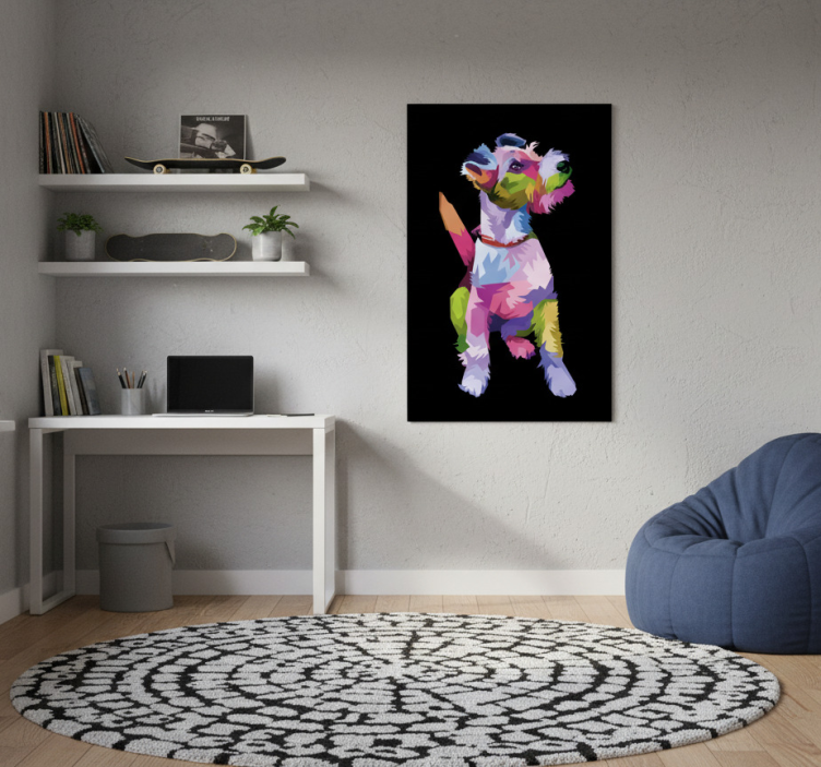 Reference: G775Introducing our stunning Living room poster geometric animals fox terrier, a vibrant and artistic representation that features a captivating design with bold geometric shapes and a delightful fox terrier illustration. This unique piece showcases high colour intensity and a semi-matt finish without reflections, making it the perfect focal point for any living space while ensuring durability with its 180g/m2 grammage.