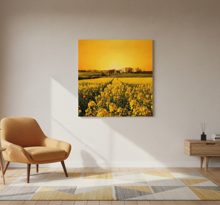 Reference: G799Introducing our stunning Living room poster yellow flower field artwork, a vibrant piece that brings the beauty of nature indoors! This artwork features a mesmerizing yellow flower field, crafted with a 180g/m2 grammage that ensures durability, complemented by a semi-matt finish for a glare-free experience. The high color intensity makes the flowers pop, creating a warm and inviting atmosphere in any space.