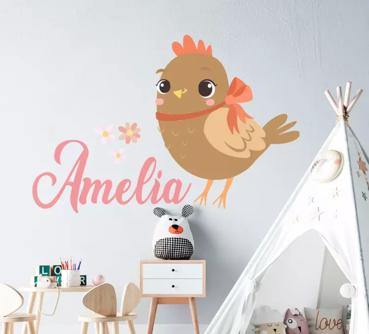 Reference: A48923A charming representation of a bird with a bow, surrounded by small flowers. This playful design is perfect for personalizing a child's space, adding a touch of warmth and joy to any environment. The character evokes feelings of liveliness and innocence.
