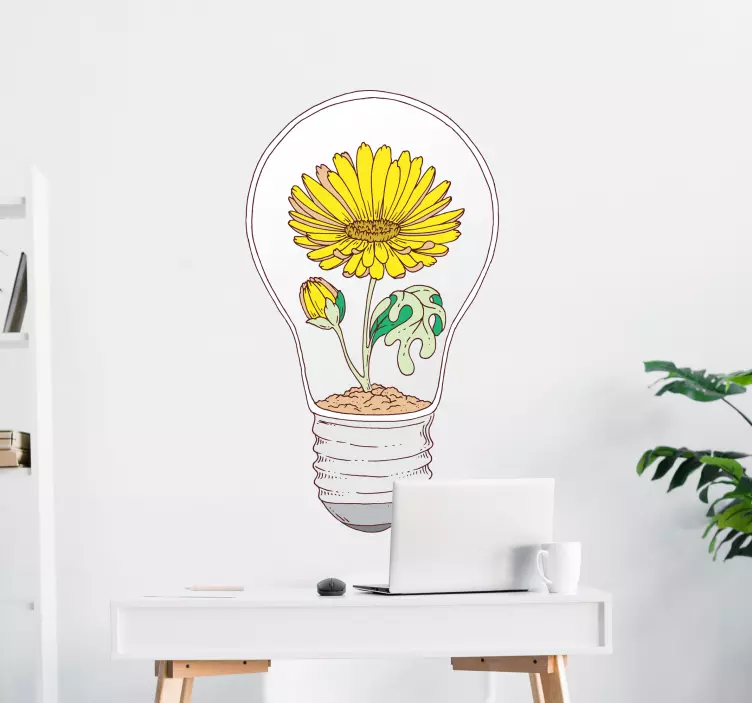 Transform your space with our stunning Blooming light bulb wall sticker! This captivating design features a vibrant lightbulb intertwined with a beautiful sunflower and lush leaves, symbolizing nature and growth. The illustration showcases a cheerful yellow palette, perfect for brightening any room. Invite the essence of nature into your home with this conceptual piece that not only decorates your walls but also inspires joy!