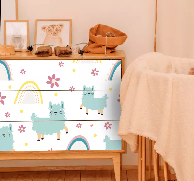 Introducing our Charming llama concept wall sticker, a delightful design that features playful llamas frolicking among colorful flowers and vibrant rainbows. This whimsical illustration brings a sense of joy and cheer to any space, making it the perfect addition to your home decor. The charming pattern of llamas combined with the bursts of color creates an inviting atmosphere, ideal for brightening up your furniture and enhancing your overall interior design!