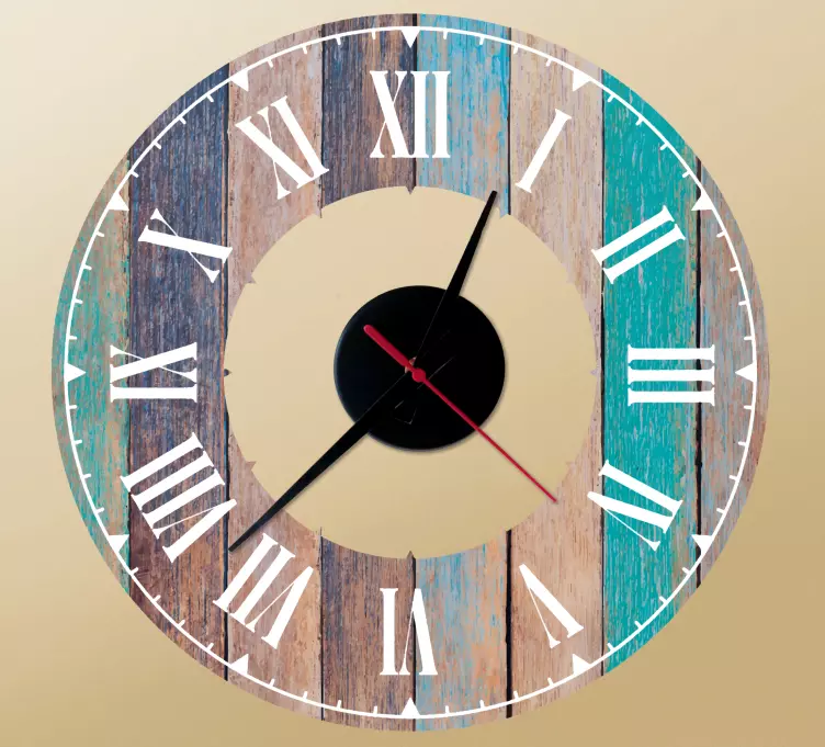 Reference: A49324This design features a charming clock face with an array of roman numerals arranged around a circular wood effect. The combination of colors and textures adds a rustic feel, making it an elegant addition to any living space.