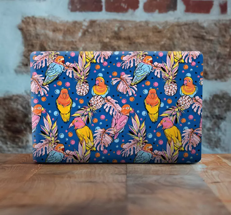 Elevate the style of your laptop with our beautiful decorative laptop vinyl decal wrap. This stunning design features various birds with tropical leaves on a mesmerizing blue background, creating a captivating illustration of nature.