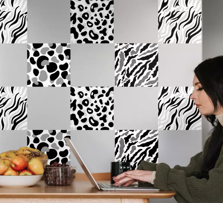 Transform your space with our Decoration wall sticker elegant patterned tiles, a stunning fusion of modern design and artistic flair. This exquisite design features elegant tile motifs combined with a captivating leopard animal print, all in a monochrome palette that exudes sophistication. The abstract and geometric elements create a striking texture, making it a perfect choice for contemporary interiors!
