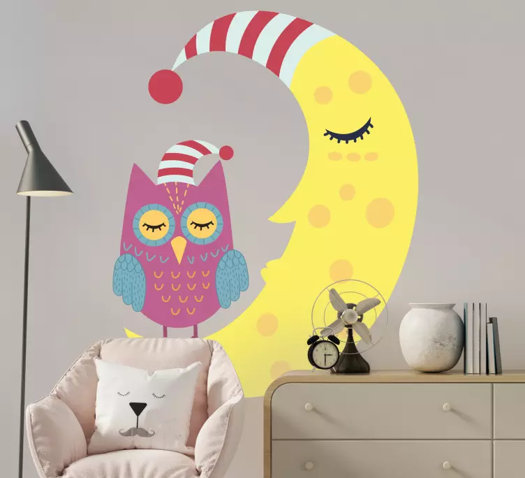Transform your child's room into a whimsical dreamland with our Drowsy owl luna wall stickers for kid! Featuring a stunning design that includes a moon, a cute cartoon owl gently sleeping under the night sky, these vibrant and colorful wall stickers are perfect for creating a cozy atmosphere. Your little one will love their new bird friend as they drift off to sleep!