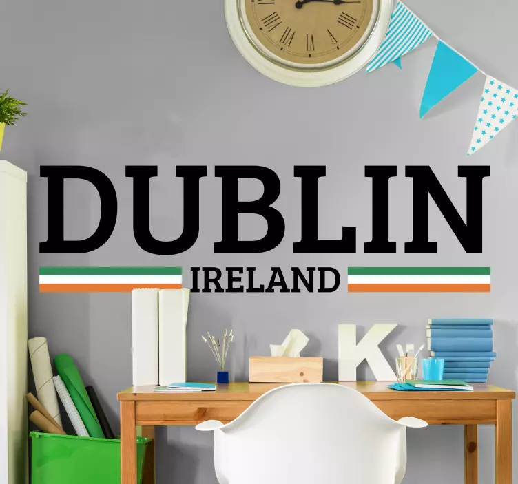 The Dublin Ireland Wall Sticker features the inscription of Dublin with its country flag color stripes. This simple and lovely country wall sticker is perfect for any space, including living rooms, bedrooms, offices, and businesses.