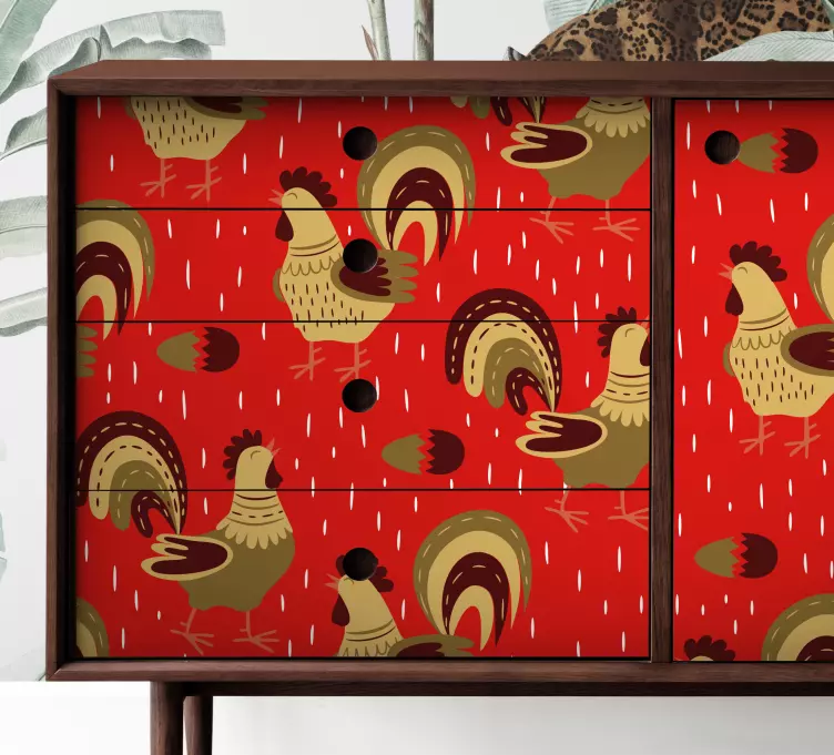 Reference: A51644A vibrant design featuring playful roosters, showcasing their charming forms against a striking red background. This cheerful motif adds a lively touch to any space, celebrating the rustic charm of farm life. The repeating figures emphasize warmth and whimsy, perfect for a playful atmosphere.
