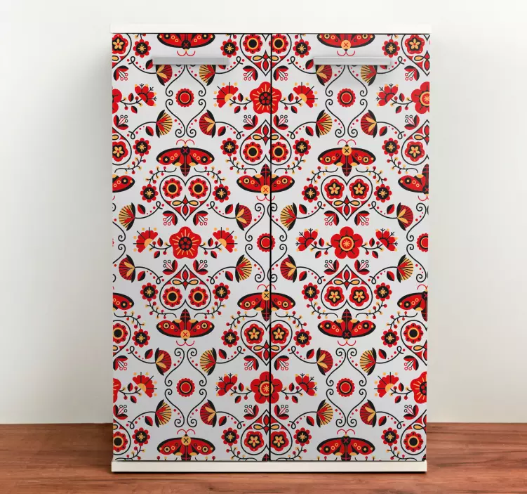 Transform your kitchen with our stunning Fridge sticker botanical pattern design, a vibrant fusion of folk art featuring colorful butterflies and ornate floral motifs. This delightful design captures the essence of nature, bringing a lively touch to your home decor. The intricate pattern showcases a harmonious blend of flowers and butterflies, making it an eye-catching addition to any space.