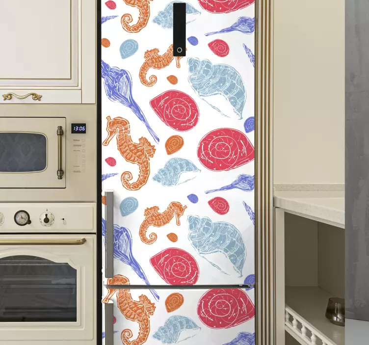 Introducing our vibrant Fridge sticker seahorse and shells, a delightful addition to your home decor that captures the essence of the sea! This stunning design features playful seahorses and charming seashells, all set against a colorful backdrop that brings the magic of marine life right to your kitchen. Perfect for adding a touch of aquatic charm to your appliance, this sticker is sure to make your fridge stand out with its intricate pattern and lively colors.