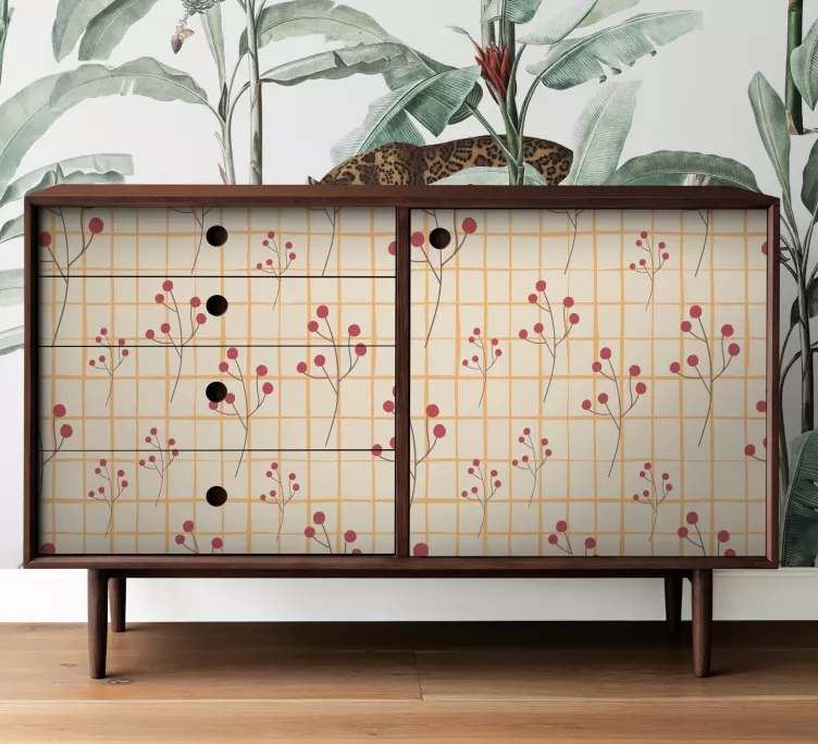 Transform your living space with our Furniture sticker floral pattern chest. This stunning design features a delightful blend of checkered and grid patterns intertwined with vibrant berries and floral elements. The colorful motifs are perfect for enhancing any furniture, especially drawers and chests, adding a refreshing touch that brightens up your home!