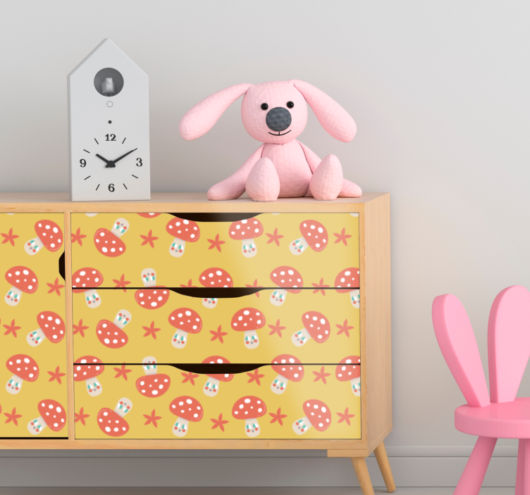 Introducing our Furniture sticker mushroom pattern design, a whimsical and playful decor piece perfect for brightening up any space! This delightful design features enchanting fly agaric mushrooms surrounded by twinkling stars, all set against a cheerful yellow background. Ideal for children's decor, this product adds a touch of magic to furniture, creating a fun and inviting atmosphere for kids and families alike!