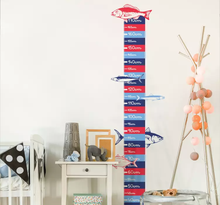 Reference: A44979Featuring a playful height measurement chart, this design integrates vibrant fish illustrations alongside clear measurement markings. It serves as both a functional tool for tracking growth and an attractive accent, making it perfect for a child's room. The cheerful colors enhance any space.