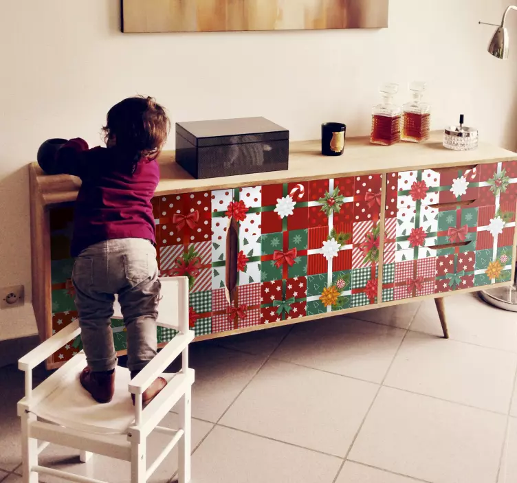Transform your festive celebrations with our stunning Holiday sticker for festive gift wrapping. This beautifully designed sticker features a charming pattern of furniture, gifts, and christmassy elements, all wrapped in a delightful red and green color palette. The squared patterns and decorative bows add a touch of elegance, making your presents stand out under the tree. Let your gifts shine this holiday season!