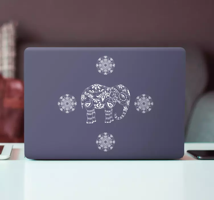 Reference: A49562An intricate representation of an elephant framed by decorative circular patterns. This design combines artistry with charm, offering a unique personality to the laptop surface. The elephant symbolizes wisdom and strength, making this piece both appealing and meaningful.
