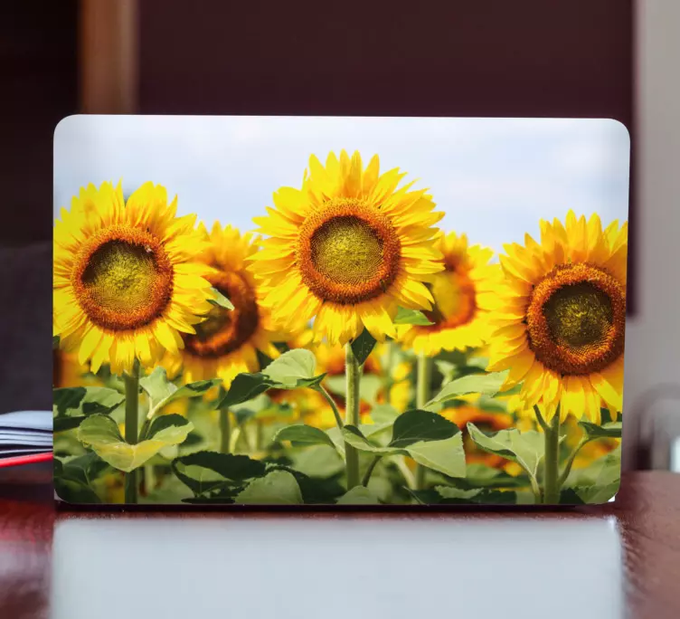 Transform your laptop into a vibrant masterpiece with our Laptop skin sunflower field scene. The design features a breathtaking landscape filled with radiant sunflowers, inviting the beauty of nature and the outdoors right to your fingertips. Each yellow flower captures the essence of a warm, sunny day, making this skin a perfect addition for those who love vegetative themes and floral aesthetics.