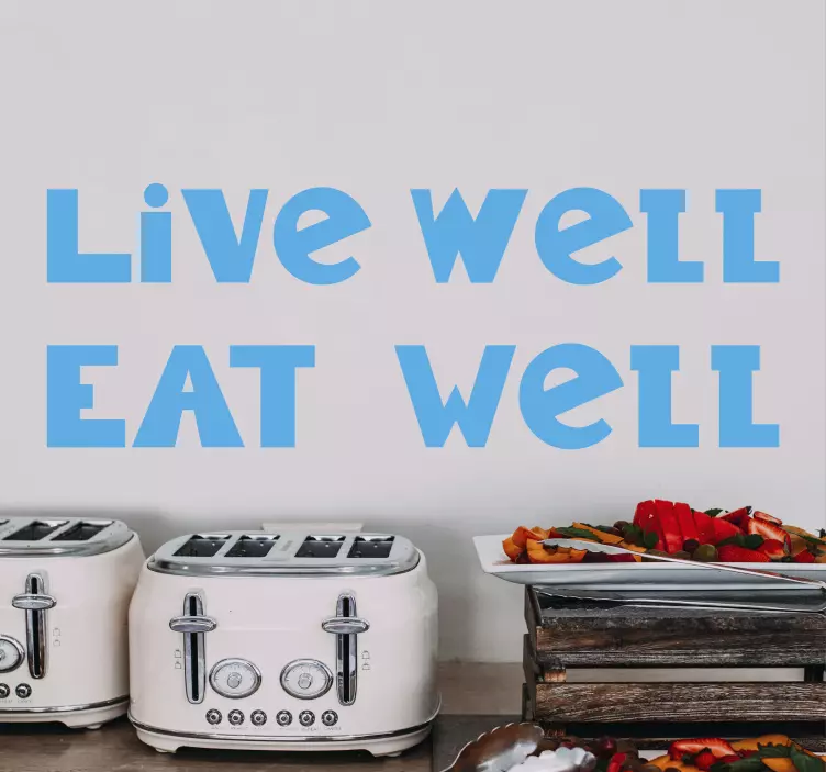 Living well means eating well, and what better way to remind yourself of this than with a stylish kitchen wall sticker? This wall sticker can be placed in your kitchen or dining room, adding a touch of elegance to your home. The monochrome design allows you to choose from a variety of colors available on our website. The text 'live well eat well' will inspire healthy habits and a positive lifestyle. So why not decorate your home with this beautiful wall sticker today?